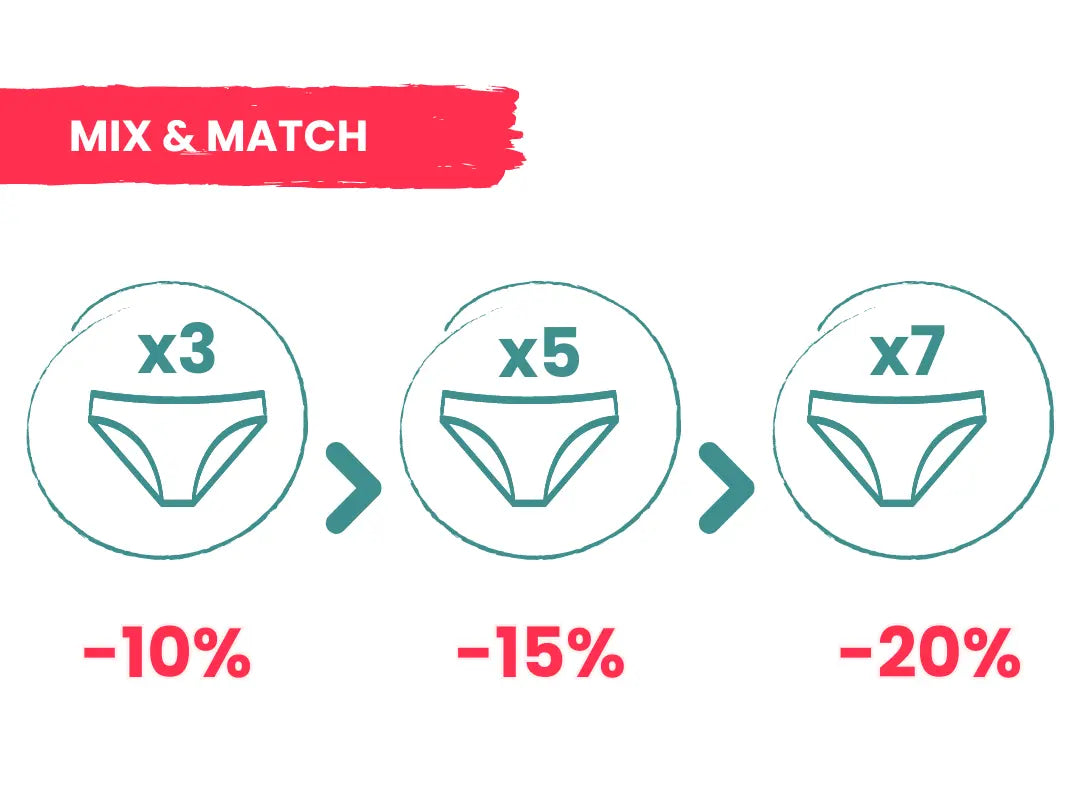 Compune-ți pack-ul de chiloți menstruali Libréa și economisește! În funcție de numărul comandat de chiloți, poți beneficia de reduceri cuprinse între 10 și 20%.